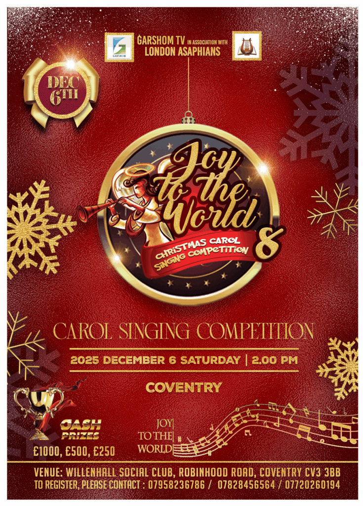 യു കെയിലെ വിവിധ ഗായക സംഘങ്ങളെ അണിനിരത്തിക്കൊണ്ട് ഗർഷോം ടി വി യും ലണ്ടൻ അസാഫിയൻസും ചേർന്ന് കഴിഞ്ഞ ഏഴു സീസണുകളായി നടത്തിവരുന്ന ക്രിസ്മസ് കരോൾ ഗാനമത്സരത്തിന്റെ എട്ടാം പതിപ്പ് 2025 ഡിസംബർ 6 ശനിയാഴ്ച കവൻട്രി വില്ലൻ ഹാൾ സോഷ്യൽ ക്ലബ്ബിൽ വച്ചു നടക്കും. ഉച്ചകഴിഞ്ഞു 2 മണി മുതൽ നടത്തപെടുന്ന സംഗീത വിരുന്ന് വിവിധ ഗായകസംഘങ്ങളുടേയും ക്വയർ ഗ്രൂപ്പുകളുടെയും യുവഗായകരുടെയും ഒത്തുചേരലിനു വേദിയാകും. പരിപാടിയിൽ സംഗീത സാംസ്കാരിക ആത്മീയ മേഖലകളിൽ നിന്നുള്ള വിശിഷ്ട വ്യക്തികൾ പങ്കെടുക്കും. കരോൾ ഗാന മത്സരങ്ങൾക്ക് ശേഷം പ്രമുഖ ഗായകരെയും സംഗീതജ്ഞരെയും അണിനിരത്തികൊണ്ട് ലണ്ടനിലെ പ്രമുഖ സംഗീത ബാന്റായ ലണ്ടൻ അസാഫിയൻസ് അവതരിപ്പിക്കുന്ന ലൈവ് മ്യൂസിക്കൽ ഷോയും നടക്കും.
