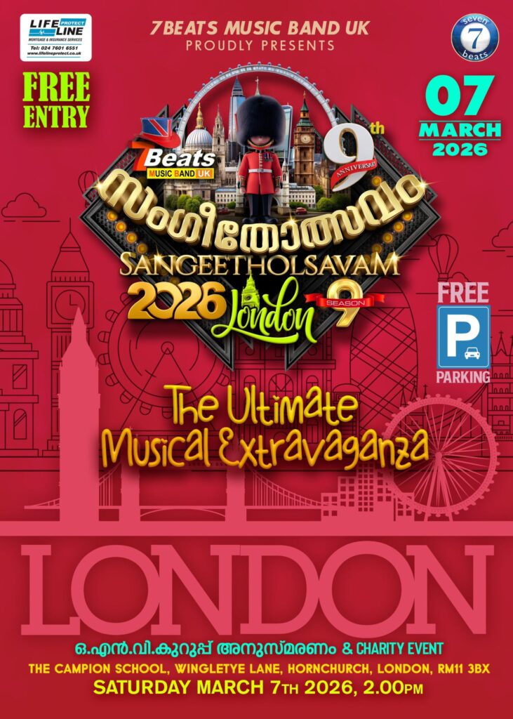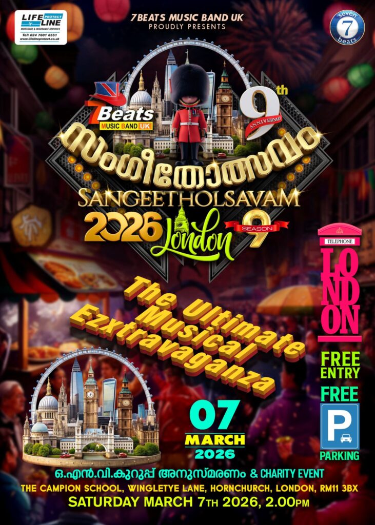 യു കെ യിൽ സംഗീത-നൃത്ത വിസ്മയങ്ങളൊരുക്കിയും, ജീവ കാരുണ്യ പ്രവർത്തനങ്ങൾ നടത്തിയും, മലയാളികളുടെ ഹൃദയ വേദിയിൽ ഇടംപിടിച്ച 7 ബീറ്റ്സ് മ്യൂസിക് ബാൻഡ് ഒരുക്കുന്ന 7 ബീറ്റ്സ് സംഗീതോത്സവത്തിനു, ലണ്ടനിലെ ഹോൺചർച്ചിൽ അരങ്ങൊരുങ്ങുന്നു. ലണ്ടൻ മഹാനഗരിയുടെ ഹൃദയഹാരിയിൽ ഇദംപ്രദമായി നടത്തപ്പെടുന്ന 7 ബീറ്റ്സ് സംഗീതോത്സവം സീസൺ 9 & ചാരിറ്റി ഈവന്റിന് ഈ വർഷം അണിയറ ഒരുക്കുക ലണ്ടനിലെ പ്രമുഖ സാംസ്കാരിക-സാമൂഹിക സംഘടനകളുടെ സഹകരണത്തോടെയാണ്. 2026 മാർച്ച് 7 നു ശനിയാഴ്ച്ച 2 മണിമുതൽ രാത്രി 10 മണി വരെയാണ് സംഗീത-നൃത്തോത്സവത്തിനായി സമയം ക്രമീകരിച്ചിരിക്കുന്നത്.