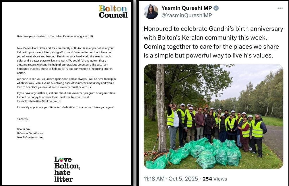 In a heartwarming gesture, Bolton Council has extended its appreciation to the 22 volunteers of the Indian Overseas Congress (UK) – Kerala Chapter, Midlands Area, who took part in a street clean-up drive organised at Bolton Children’s Park on the occasion of Gandhi Jayanti.