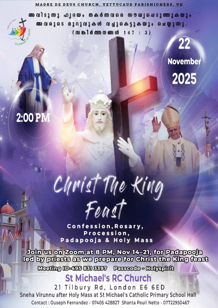 ആശ്വാസദായകനായ ക്രിസ്തുനാഥന്റെ രാജത്വ തിരുന്നാളില് പങ്കെടുത്ത് അനുഗ്രഹം പ്രാപിക്കുവാന് ഏവരെയും Vettucaud Parishioners Uk സ്നേഹപൂര്വ്വം യേശുനാമത്തില് സ്വാഗതം ചെയ്യുന്നു.