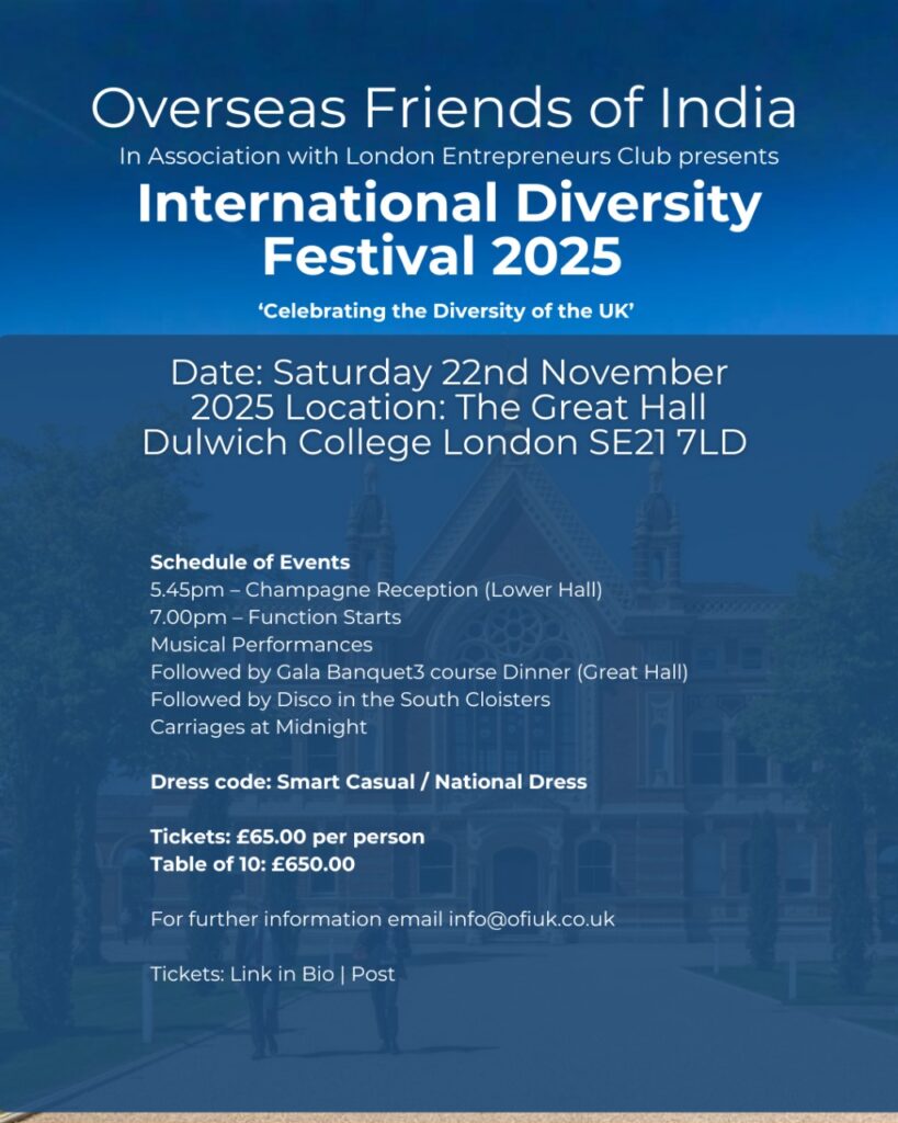 Join us for an inspiring evening at Dulwich College on Friday, 22 November 2025, as we come together to celebrate the International Diversity Festival — a vibrant gathering that honours the contributions, gratitude, and shared future of London’s richly diverse communities.