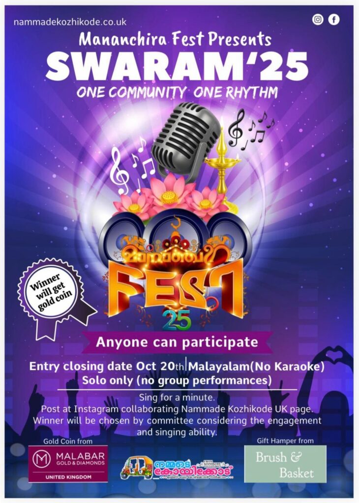 The grand celebration will take place at Eastbury Community School, Barking (IG11 9UW), starting at 12:00 p.m., with the official inauguration scheduled for 3:30 p.m. The festival promises an unforgettable day filled with nostalgia, music, food, and cultural performances – a true taste of “Nammade Kozhikode” right here in London.